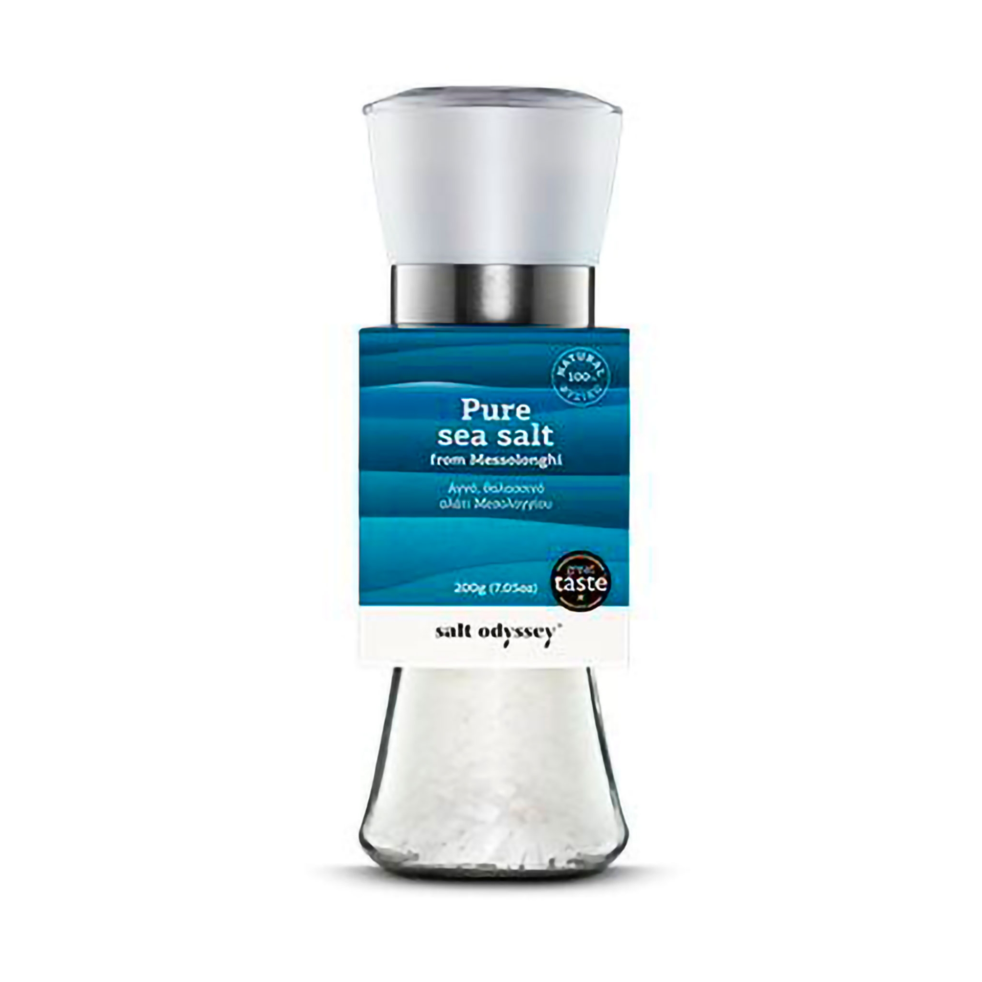 100% natuurlijk zeezout uit Messolonghi. De zuivere kristallen korrels van het natuurlijke zeezout van Salt Odyssey kunnen worden gemalen tijdens het koken of worden gebruikt als finishing salt in al je favoriete gerechten.